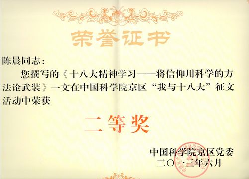 中科院京区党委于2013年3月组织开展了“我与十八大”主题征文活动。近日,征文活动评选结果揭晓,信息工程研究所选送文章《十八大精神学习——将信仰用科学的方法论武装》获得二等奖。