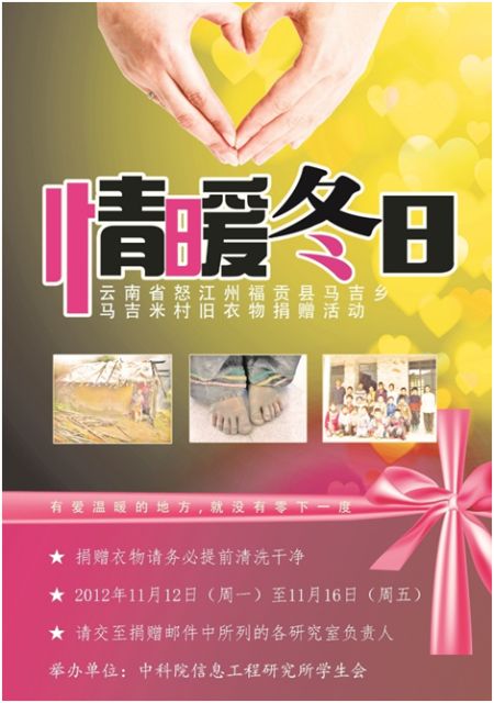 11月12日-18日,信息工程所人事教育处和学生会在信息工程所、中关村青年公寓和奥运村园区组织开展以“情暖冬日”为主题的衣物募捐活动。