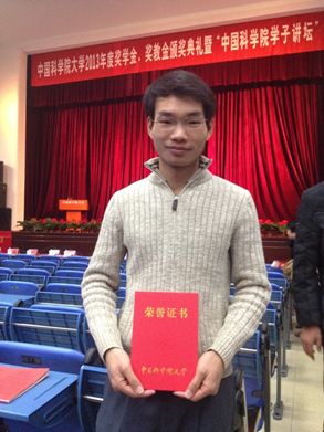 2013年11月19日,中国科学院大学2013年度奖学金颁奖典礼暨“中国科学院学子讲坛”在国科大玉泉路校区礼堂举行,中国科学院院长兼国科大校长白春礼为获奖学生颁奖,我所刘美成荣获中国科学院院长优秀奖,郭腾荣获朱李月华优秀博士生奖。