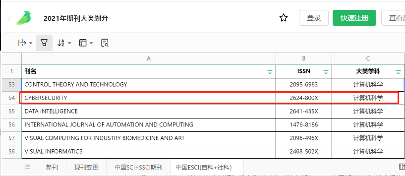 2021年期刊分区表共有6本ESCI期刊入选“计算机学科”分类,《Cybersecurity》是入选的ESCI期刊中唯一一本安全类期刊。