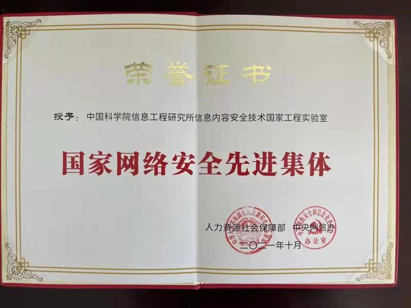 10月11日,在2021年国家网络安全宣传周开幕式上举行了首届国家网络安全先进集体和先进个人的颁奖仪式,获得全国网络安全先进的15个集体和29位个人受到表彰,信息内容安全技术国家工程实验室荣获首届国家网络安全先进集体称号。