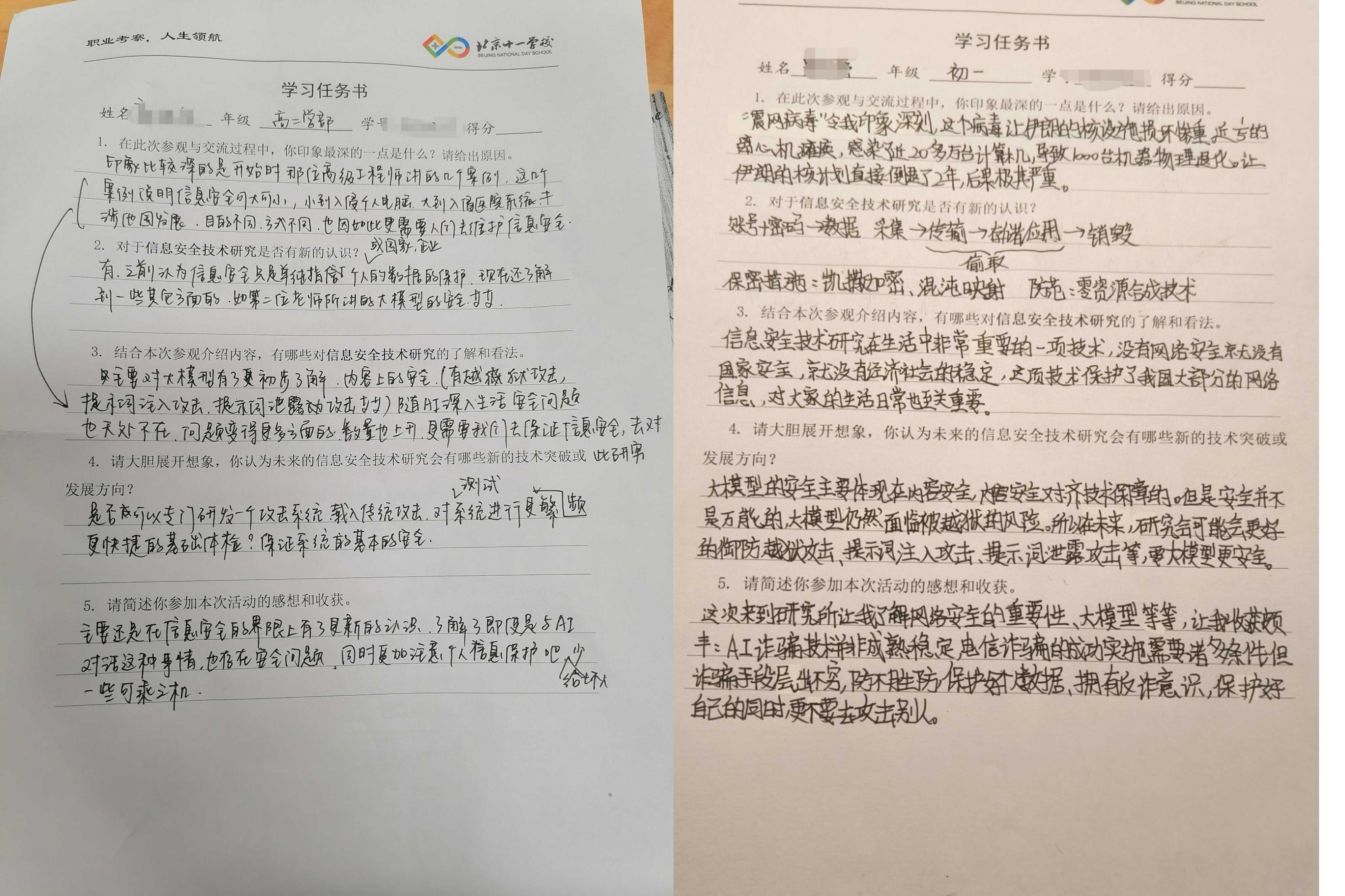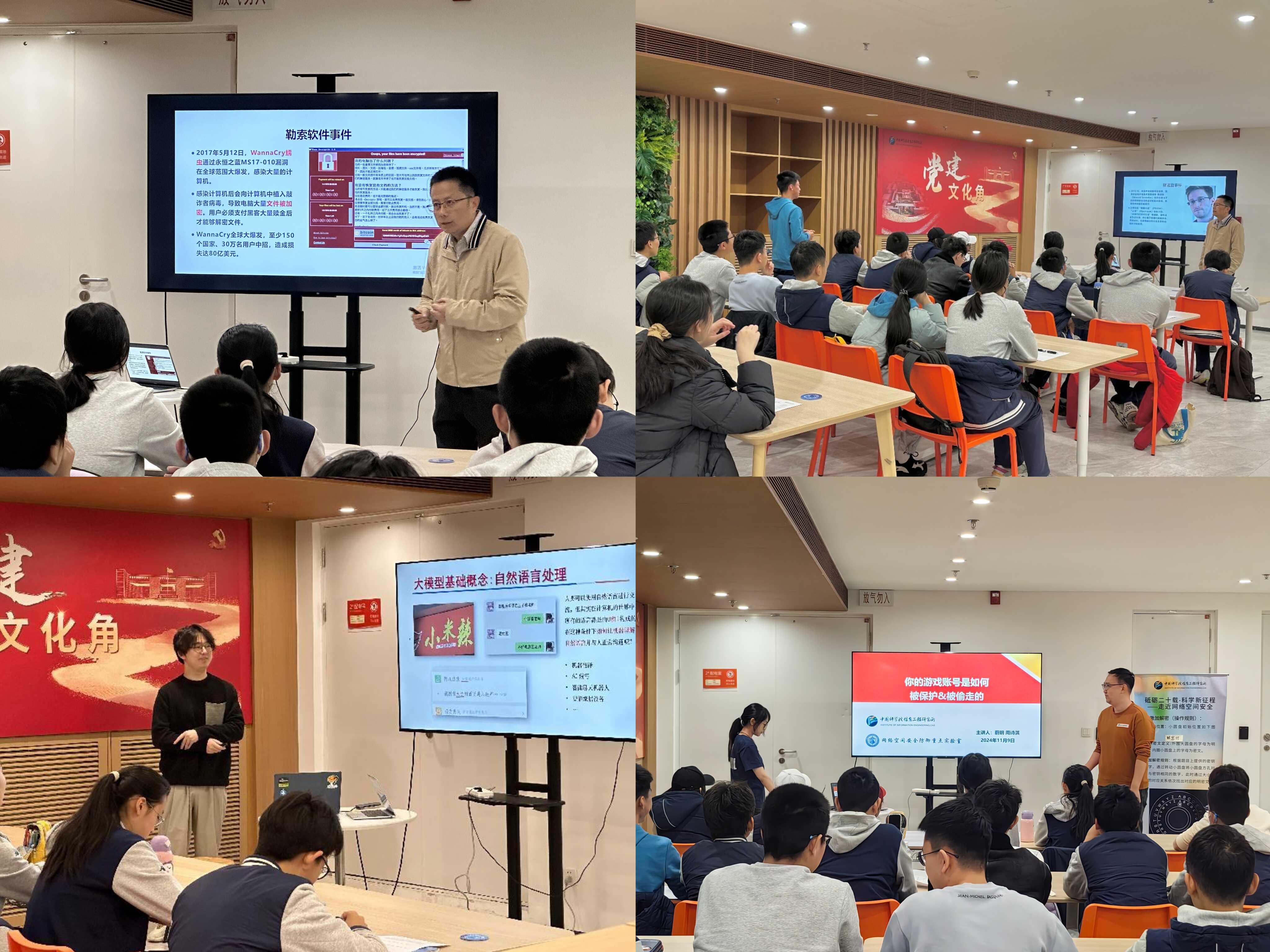 此次活动主要包括科学报告交流及研究所参观两项内容。邀请向继正高级工程师、刘通博士、周诗淇博士和蔚玥硕士分别做了《AI世界的矛与盾:探秘大模型安全的攻防之争》、《你的游戏账号是如何被保护&被偷走的》的科学主题报告,并与现场的学生进行了互动交流。几位老师向同学们列举了网络环境中存在的安全问题,例如:震网病毒、雅虎数据泄露等事件,结合自身工作以及研究方向,通过现实案例让同学们充分感受到网络安全的重要性。交流结束后,老师们带领同学参观了一二号楼的部分区域,实地感受网络安全科技工作者的工作环境,让同学们对这一职业有了更加直观的了解。