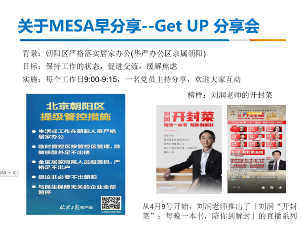 自2022年5月以来,北京市新冠病毒防控进入胶着状态。根据北京市疫情防控相关要求,位于朝阳的华严北里办公区严格执行有关规定,实行全员居家办公。为促进全体党员和群众、老师和学生在居家办公期间保持良好的沟通和交流,有效缓解大家的精神压力,维持团队良好的精神状态,二室一支部决定充分发挥党员先锋模范作用,采取每日召开晨间“GET UP”分享会的形式,活跃团队氛围,激发思想碰撞,齐心协力做好防疫和居家办公“双统筹”,赢得疫情防控和业务发展的“双胜利”。