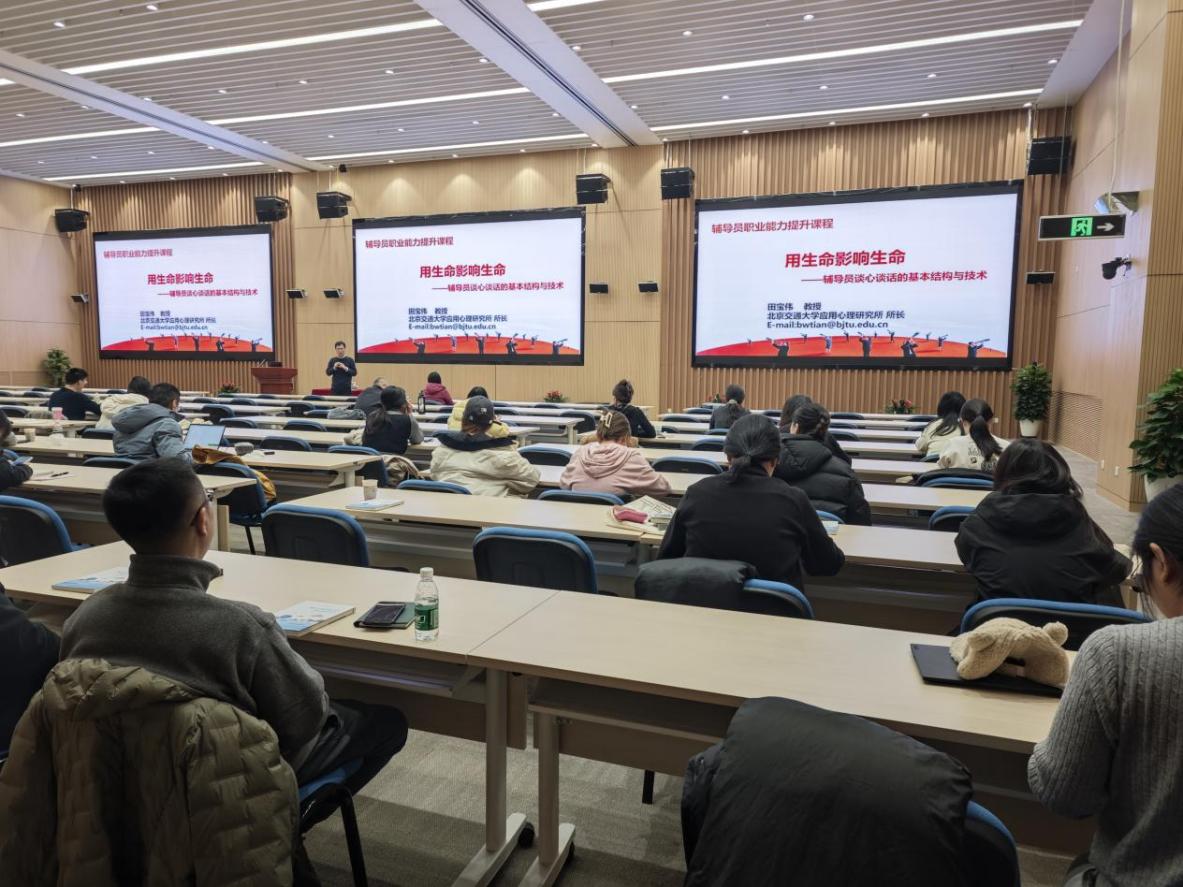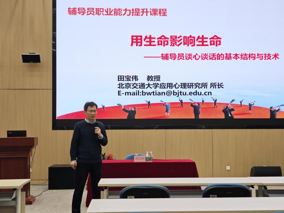 为帮助心理健康工作人员系统掌握谈心谈话技巧,提升倾听共情、情绪处理和问题解决等能力,增强谈心谈话的针对性与有效性,学生教育处于11月25日举办心理健康工作人员谈心谈话能力提升培训。本次培训由学生教育处付东梅处长主持,邀请北京交通大学应用心理研究所所长田宝伟老师主讲,各研究室心理辅导员、心理联络员共计50余人参加。